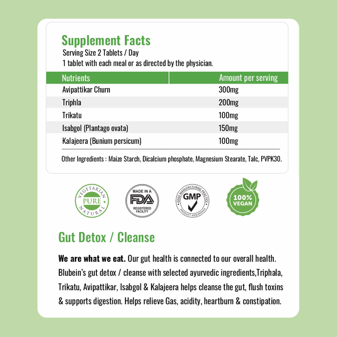 Contains Ayurvedic herbs like Trikatu, Triphala, Avipattikar Churna, Isabgol, and Kalajeera to support digestion, reduce acidity, constipation and promote gut health.