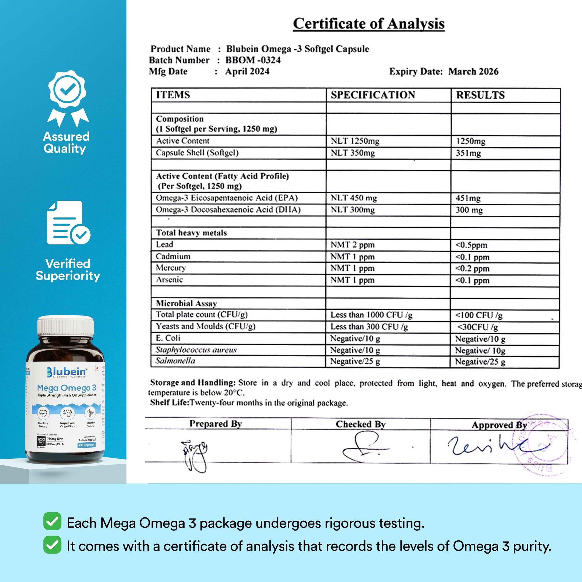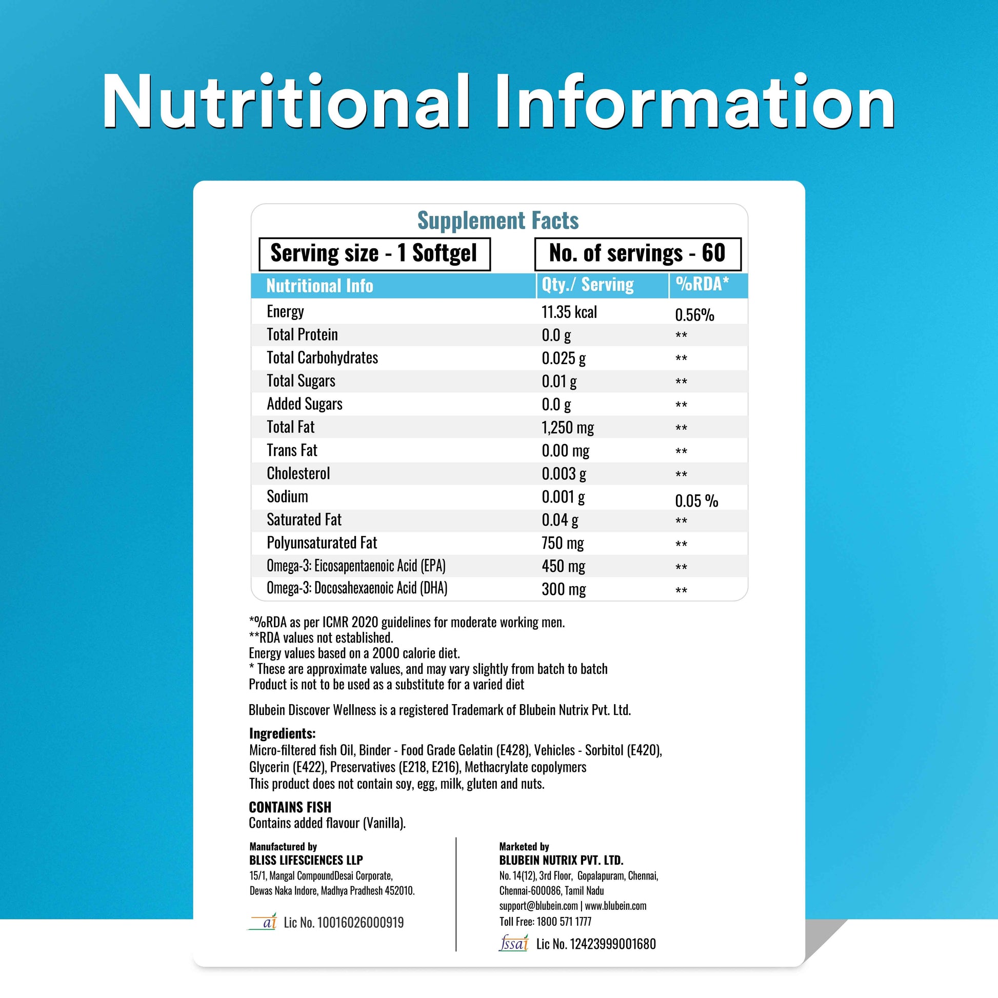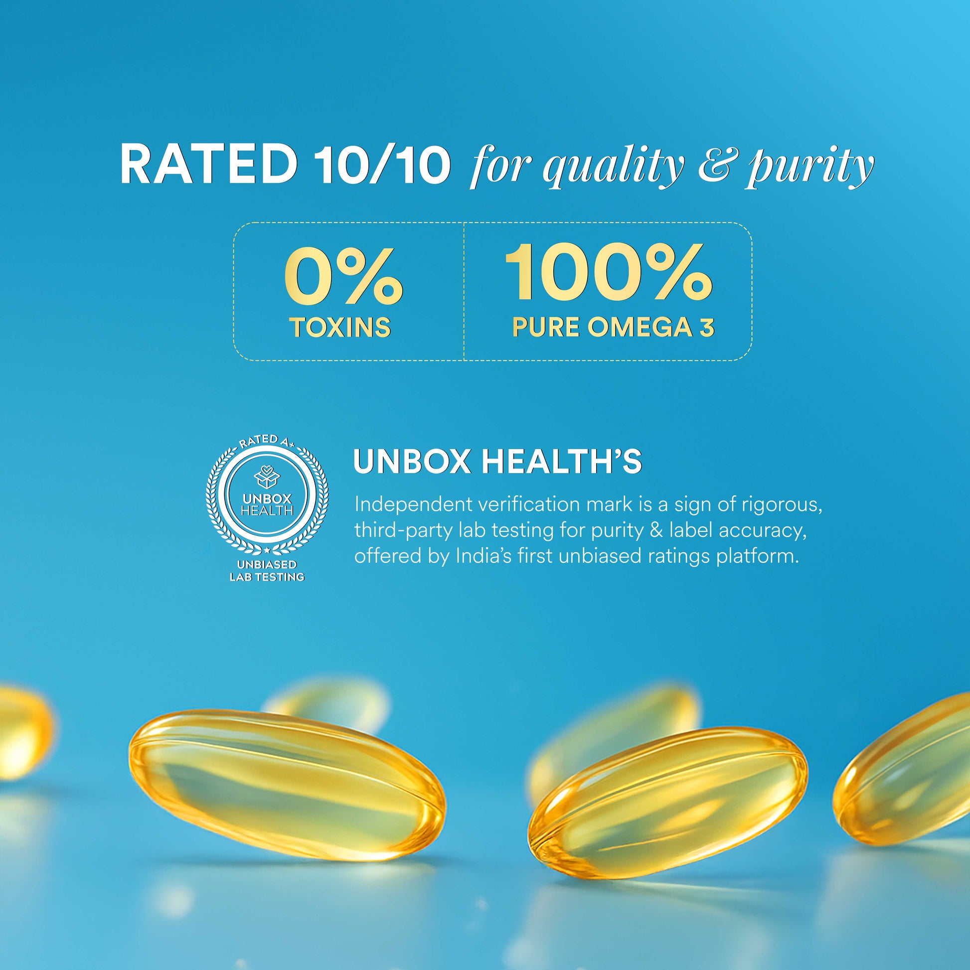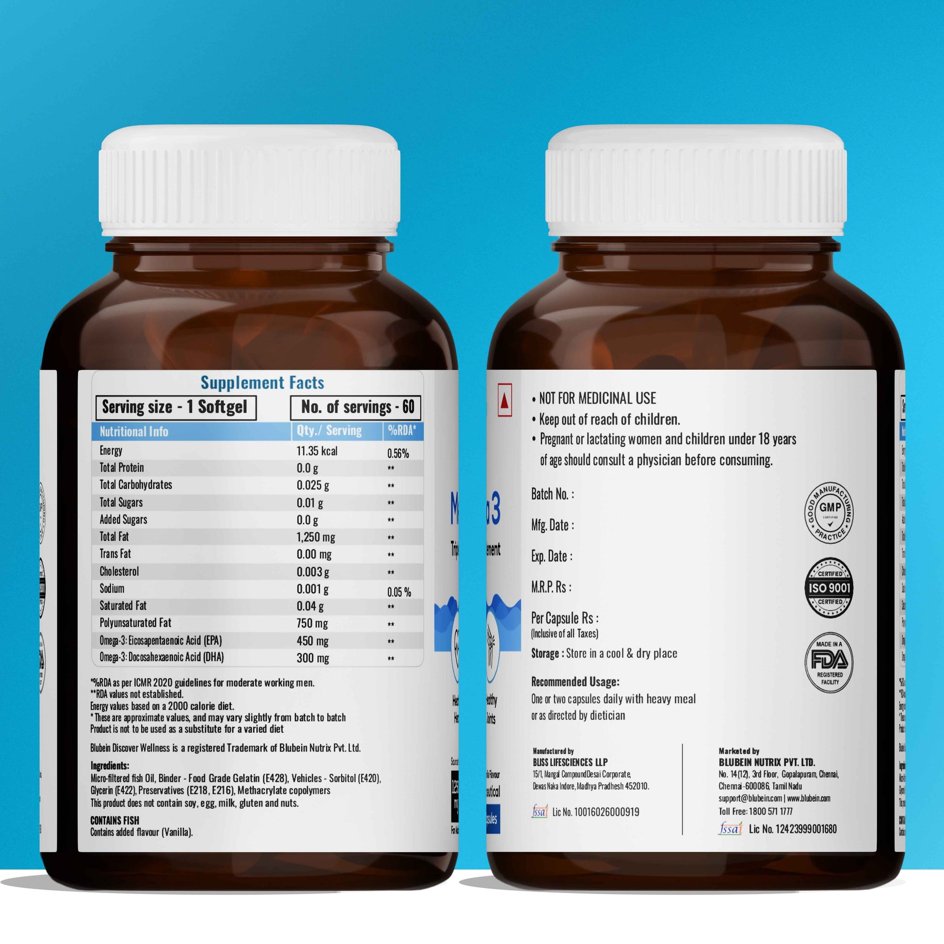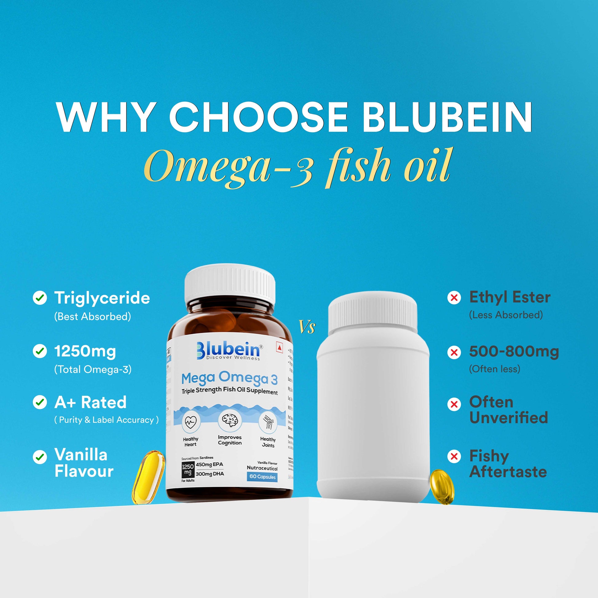 Leading health bodies recommend 1000–2000 mg of combined EPA + DHA daily for heart, brain, and joint benefits. Blubein’s Fish Oil delivers a potent, clinically-aligned dose in every capsule.